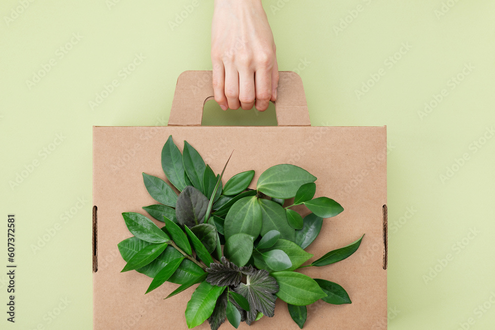 Eco cardboard box from natural recyclable materials with green leaves in woman hand on green background. Eco friendly cardbox packaging, zero waste with plastic free and nature protection concept.