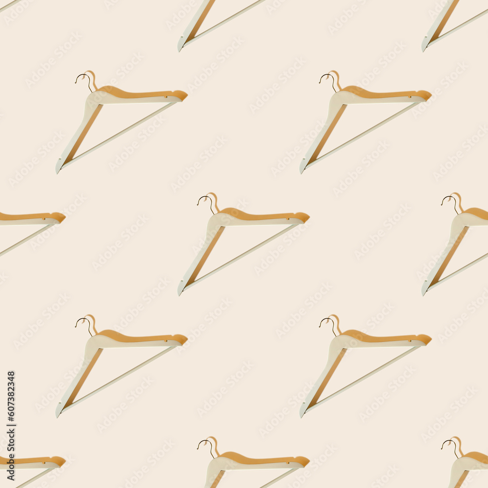 Many coat hanger on pastel background with shadows. Concept for sale, shop, second hand, online trade, brand resale platform. Seamless pattern