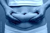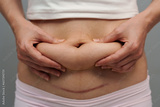 woman grabs and pinches her postpartum belly fat and c-section scar of caesarean