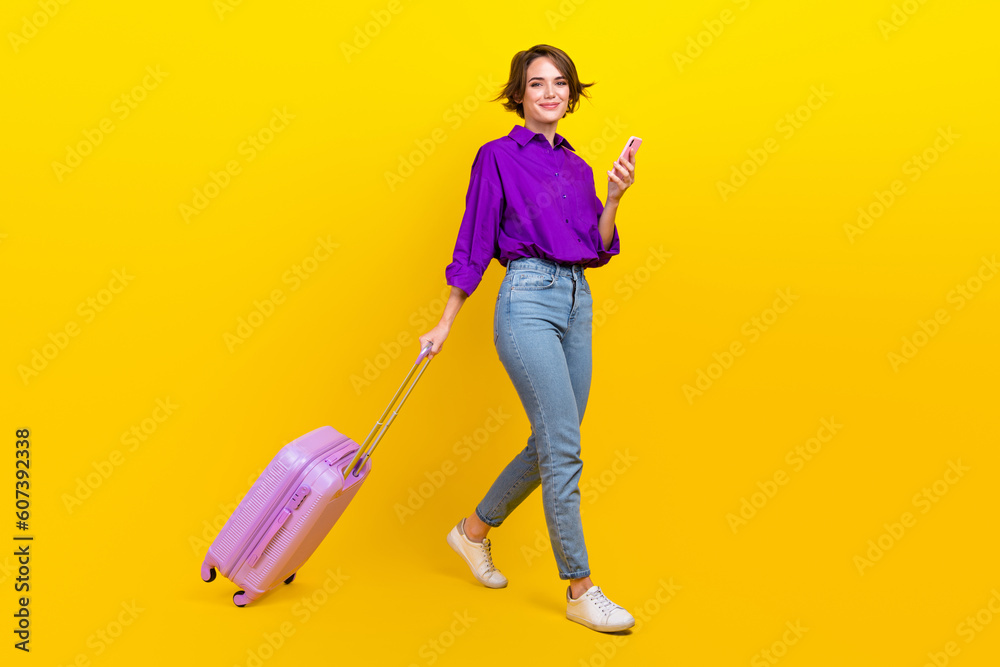 Full size photo of pretty young girl go gadget taxi application wear trendy violet smart casual outfit isolated on yellow color background