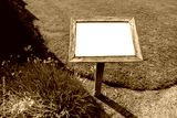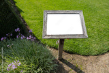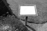 Blank white mockup template of a small notice board in a park with grass lawn. Background texture of an outdoor empty wood frame information signage for visitor to read. Copy space for your design.