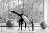 Caucasian woman sitting and balancing with trainer. fitness, sport, training and people concept.
