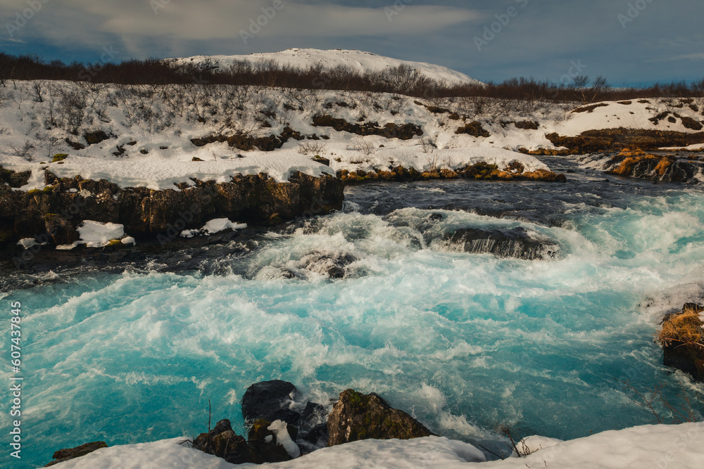 Bruarfoss waterfall and its surroundings captured on a winter afternoon in Iceland.