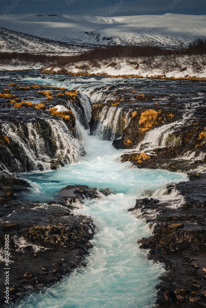 Bruarfoss waterfall and its surroundings captured on a winter afternoon in Iceland.