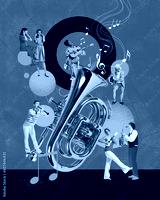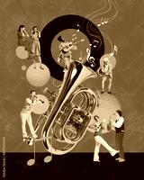 Group of talented, artistic people playing on diverse music instruments, singing. Authentic party. Contemporary art collage. Music, lifestyle, art of sound, performance concept. Creative bright design
