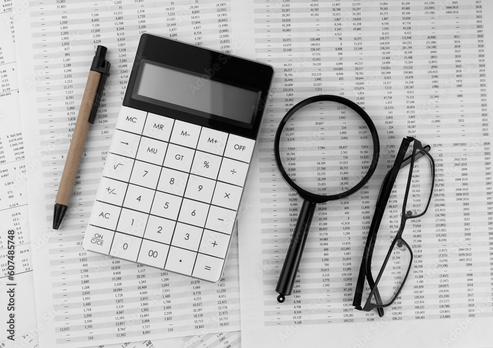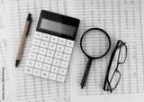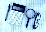 Calculator, magnifying glass, pen, eye glasses on financial statement. Top view.