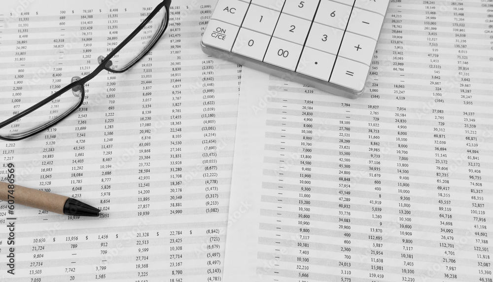 Calculator on financial documents. Top view.