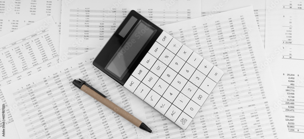 Calculator with pen on financial documents. Top view.