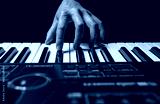 Playing a synthesizer on a dark background. The musician plays the synthesizer.