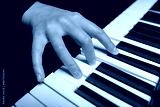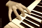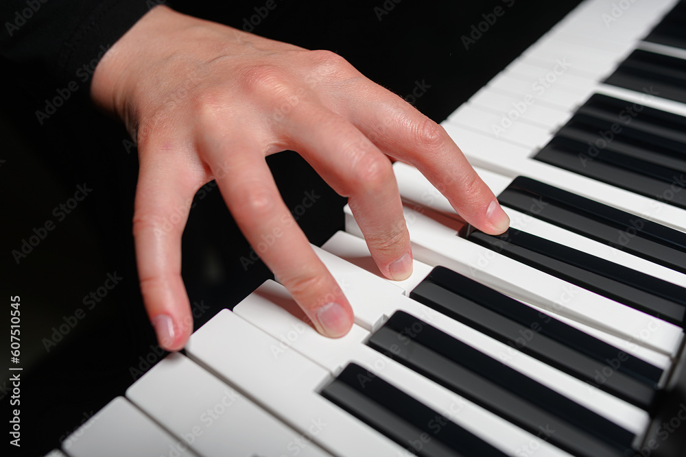 Playing a synthesizer on a dark background. The musician plays the synthesizer.
