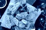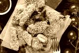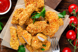 Delicious Crispy Fried Breaded Chicken Breast Strips with Ketchup on Dark Background
