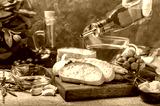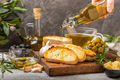Ciabattas, olive oil in a bowl with olives, herbs, spices, garlic, pesto, parmesan and ciabatta bread on a texture background.Banner. Healthy food concept.Delicacy. Mediterranean Kitchen. Copy space.