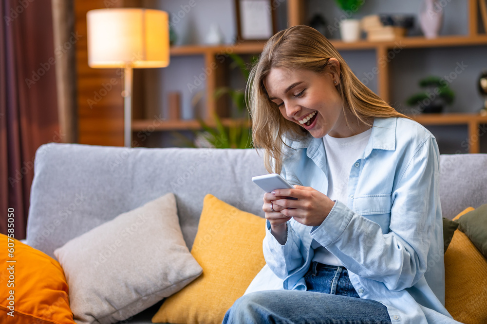 Emotional happy pretty millennial woman making yes gesture, celebrating getting amazing good news in mobile phone gadget message notification, good luck, personal success achievement concept.