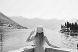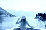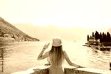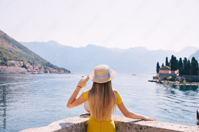 tourist girl in yellow dress enjoying view on the lake in Montenegro