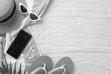 Get your tan on. Accessories laid out from top view: glasses, cap, smartphone, earbuds, flip-flops, towel, shell, palm leaves. Sandy beach scene with an empty space for text or promotion