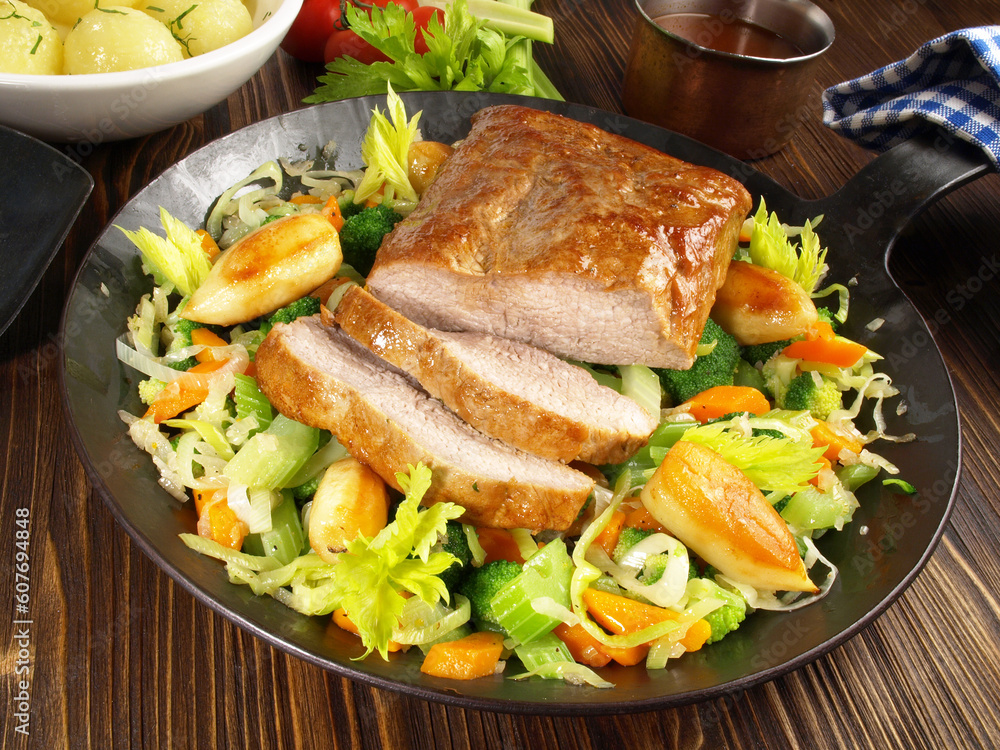 Kalbsbraten in Scheiben auf Gemüse