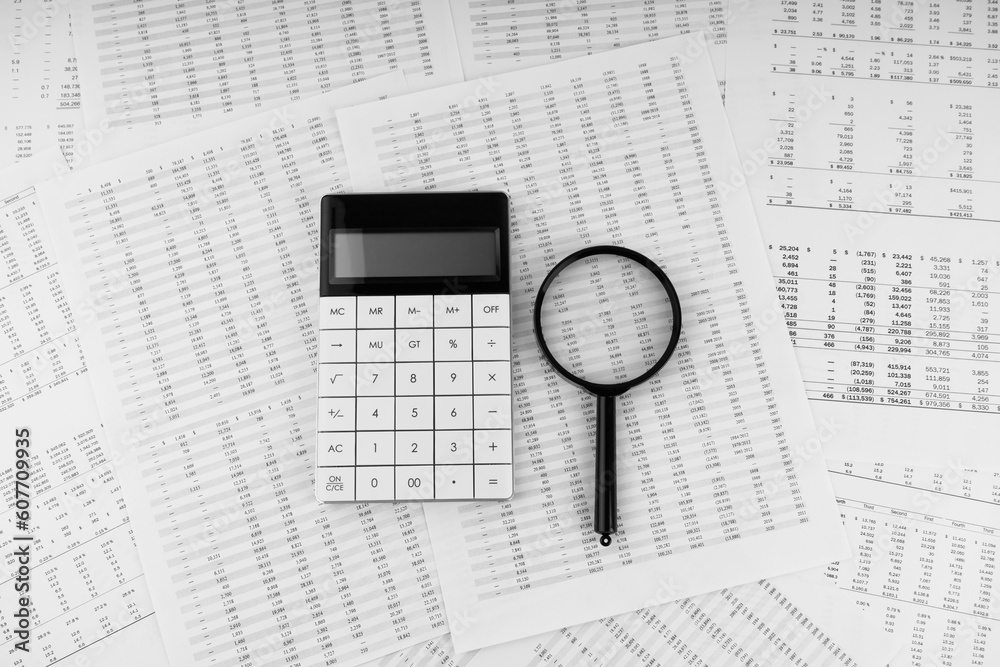 Calculator and magnifying glass on financial statement. Financial, accounting and business concept.