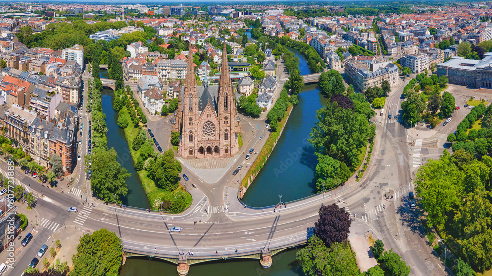 St. Paul Church and European Parliament in the background in Strasbourg - Alsace, France