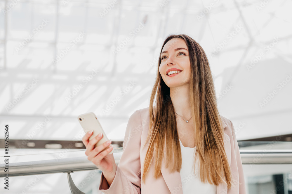 Business woman stands indoors in an office building holding a mobile phone and smiling