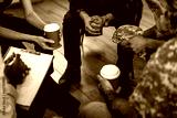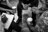 Close up of veterans hands holding cop of coffee during PTSD support group.