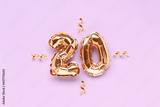 Number 20 gold inflatable balloons with ribbon confetti on a purple pastel background.