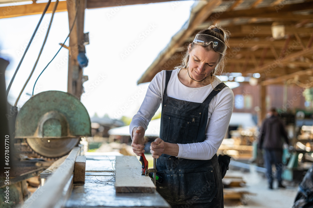 Woman working with wooden planks in a sawmill