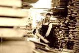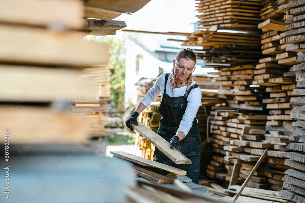 Woman working with wooden planks in a sawmill