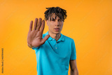 Serious african man showing rejecting gesture by stop finger sign. Dont play
