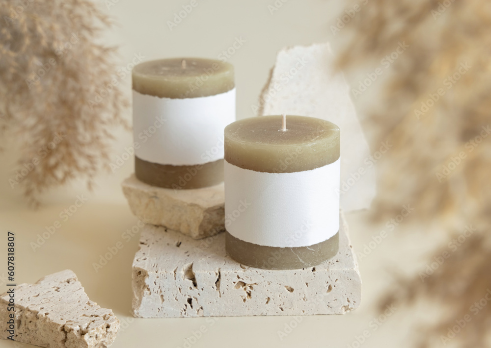 Candle with label on beige stone near dried pampas grass close up, copy space, mock up