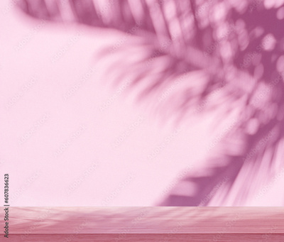 Blurred shadow of tropical palm leaves on pink wall and table top in the foreground. Summer concept.