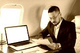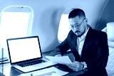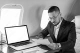 asian businessman in suit and glasses sits in private jet and works with documents near laptop with blank screen