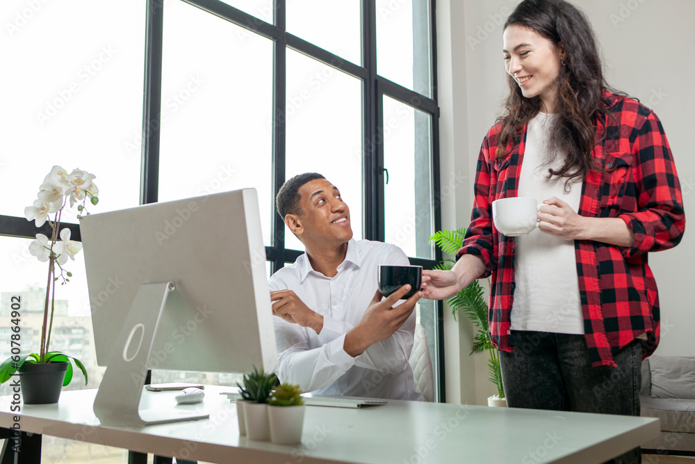 woman brought tea to her husband african american who works and sits at computer, the wife gives cup of drink