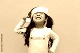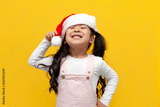 little asian girl in santa hat rejoice and smile on yellow background, korean child holding christmas accessory