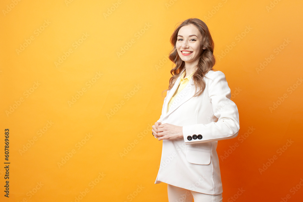 cheerful business woman in white suit fastens buttons on blazer on orange background, young girl manager
