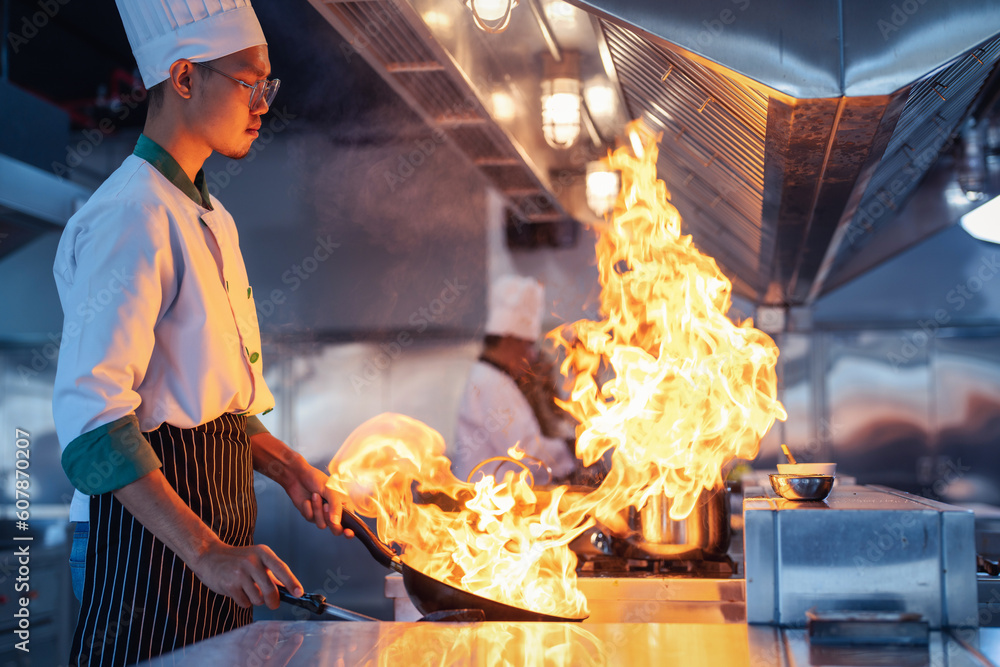 Chef in restaurant kitchen at stove and pan cooking flambe on food