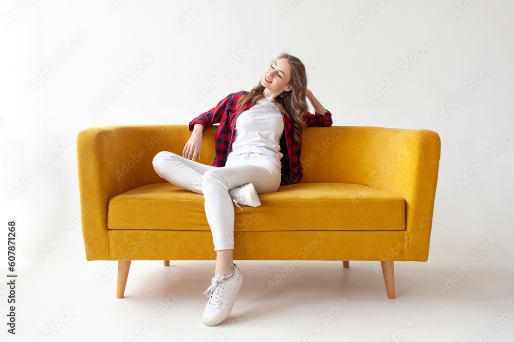 young cute girl sits on soft comfortable sofa and relaxes, pensive woman is resting on yellow couch