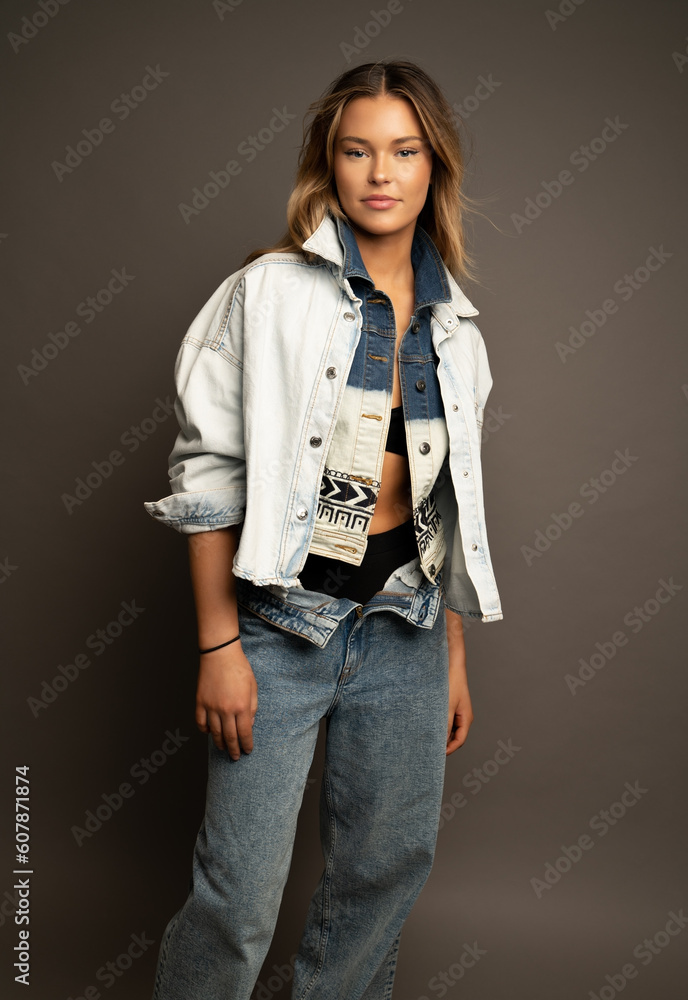 Happy blonde young girl in beautiful outfit standing on grey background.