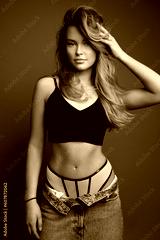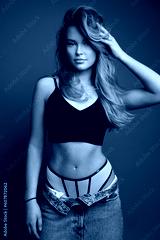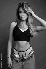 Happy blonde young girl in beautiful outfit standing on grey background.