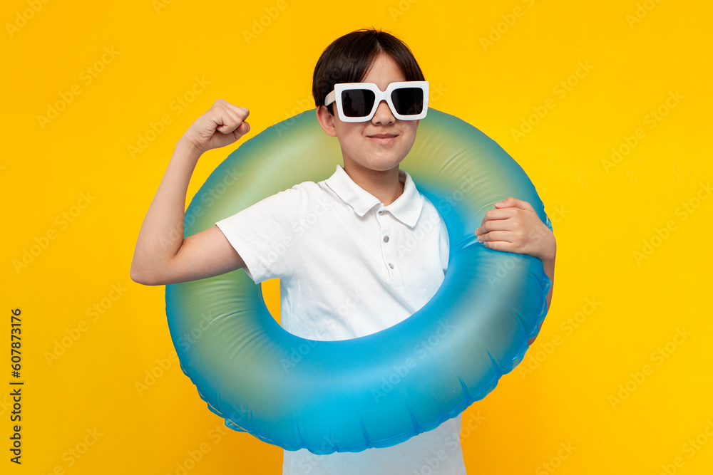 teenager boy of twelve years old in sunglasses holds an inflatable swim ring and shows gesture of strength