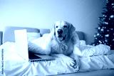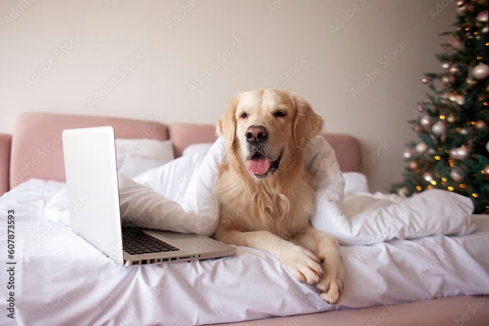 cute domestic dog lies on the bed at home and uses laptop against the backdrop of Christmas tree