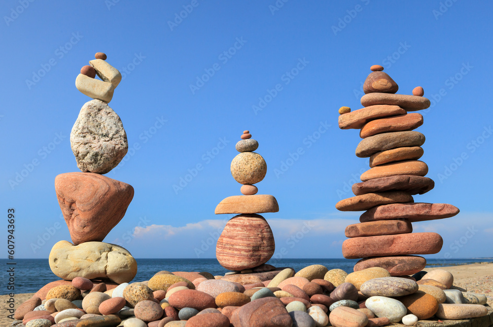 Three Rock zen pyramids of colorful pebbles standing on the beach, on the background of the sea. Concept of balance