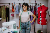 Portrait of latin fashion designer woman in workshop studio, Tailor boutique and retail creative small business in Mexico Latin America, hispanic female in fashion industry