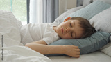 Closeup of little boy sleeping in bed next to window at morning. Kids resting, child healthcare and relaxation