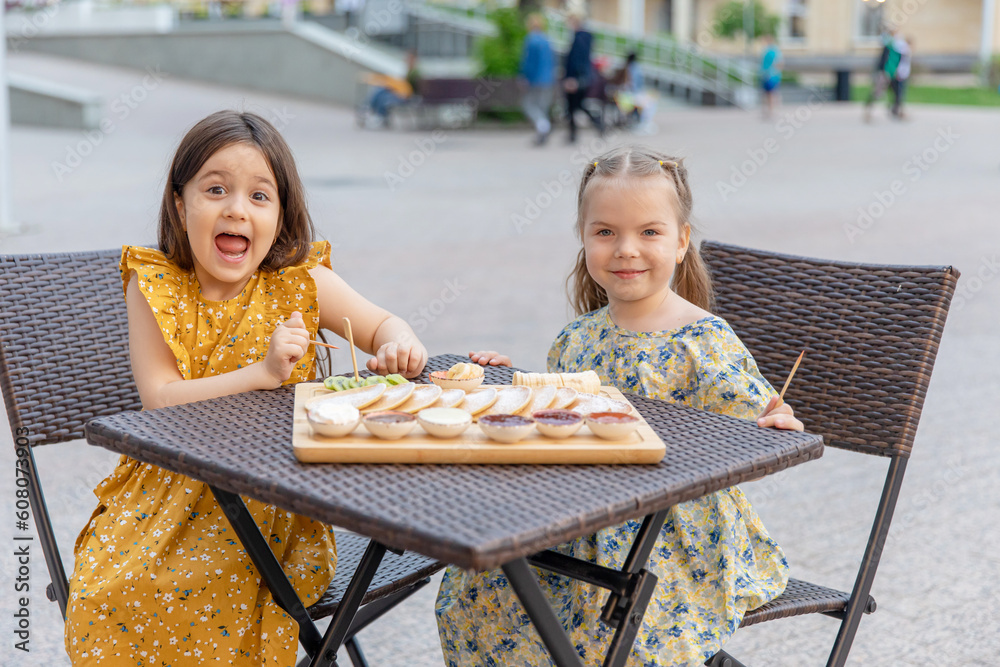 Two little girls sitting at a table on the street and eating pancakes with jam and berries. Breakfast concept