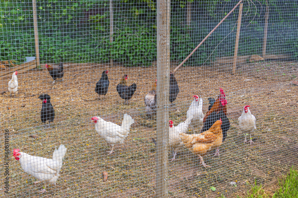 Hens in a cage outdoors in the countryside