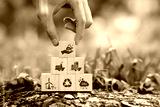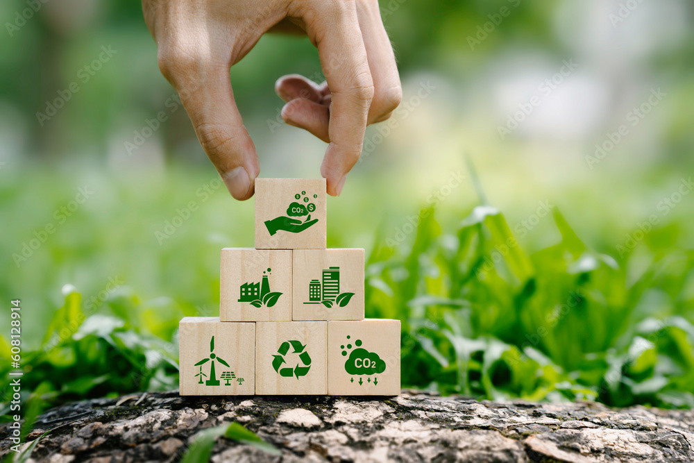 icon carbon credit or CO2 on wooden cubes. Carbon tradable certificates for Business and Environment are sustainable. industry and company Reduc of carbon emissions to Net zero greenhouse gas target.