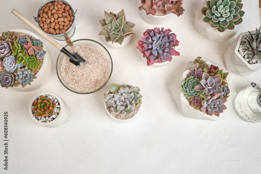 Home gardener transplanting succulent plant in ceramic pots on a table