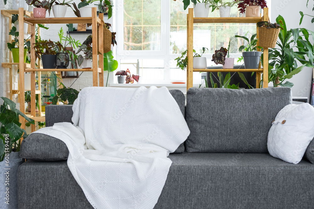 Shelving with a group of indoor plants in the interior room white loft, grey sofa, cozy plaid, carpet. Houseplant Growing and caring for indoor plant, green home