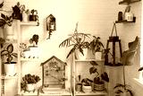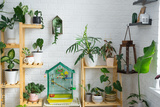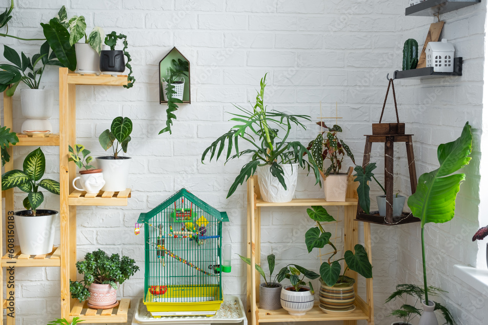 A cage with a budgie stands in a living corner of the house among shelving with a group of indoor plants in the interior. Houseplant Growing and caring for indoor plant, green home