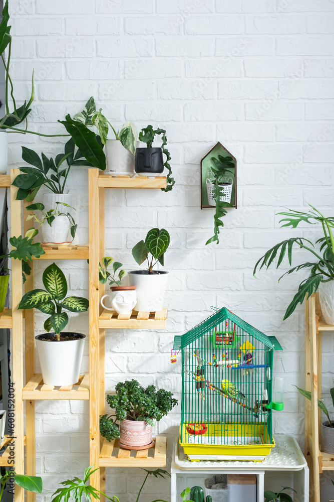 A cage with a budgie stands in a living corner of the house among shelving with a group of indoor plants in the interior. Houseplant Growing and caring for indoor plant, green home